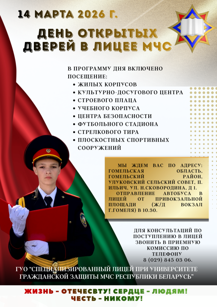 Лицей МЧС приглашает интеллектуально и физически подготовленных юношей (6-9 классы), желающих в будущем связать свою жизнь с МЧС, на День открытых дверей, который состоится 14 марта 2026 года в 11.00 по адресу: Гомельская область, Гомельский район, Улуковский сельский совет, п.Ильич, ул. Н.Сковородина, д. 1. Участники мероприятия смогут пообщаться с руководством лицея, познакомиться с учебно-материальной базой, центром безопасности МЧС, а также порядком поступления в Лицей МЧС в 2026 году. Для доставки участников мероприятия будет организован транспорт от железнодорожного вокзала г.Гомеля в 10.30.