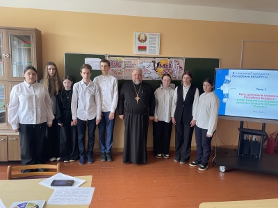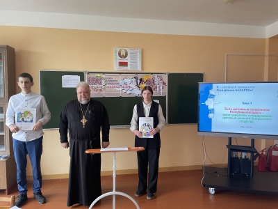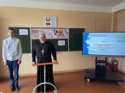 священнослужителем церкви Святого Михаила аг.Цирин Олегом Сушко. Отец Олег рассказал учащимся про деятельность Митрополита Филарета (Вахромеева), Первого Патриаршего Экзарха всея Беларуси. В своем выступлении подробно остановился на том, что Владыка Филарет говорил о любви к Родине.